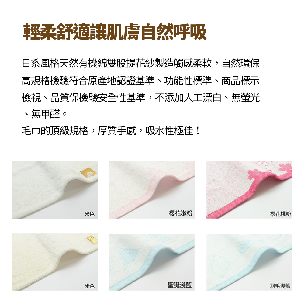 天然有機綿紗雙股提花製造,天然有機棉毛巾觸感柔軟,自然環保、舒適的觸感與肌膚輕柔接觸,自已或與家人分享,都是不錯的選擇喔!